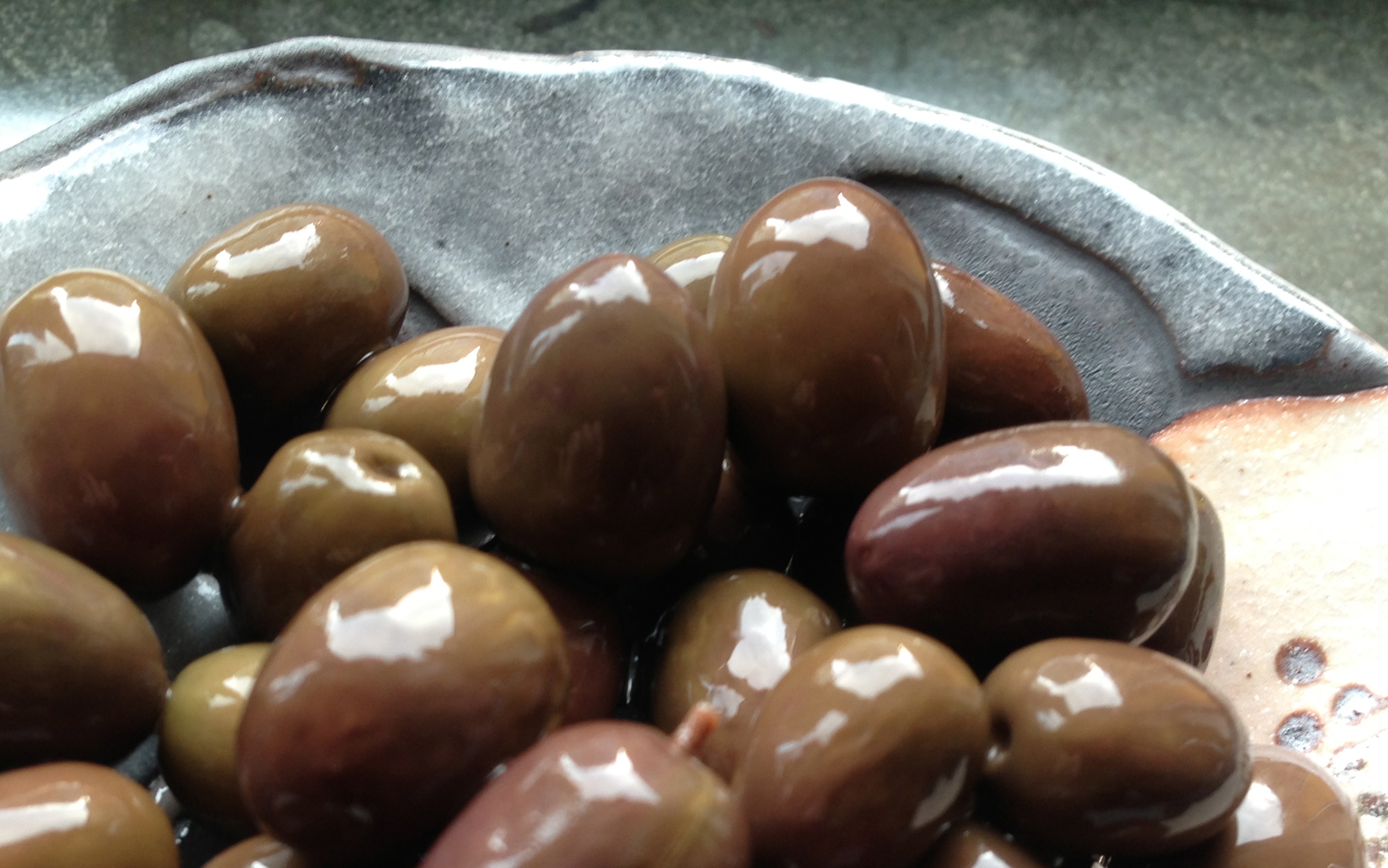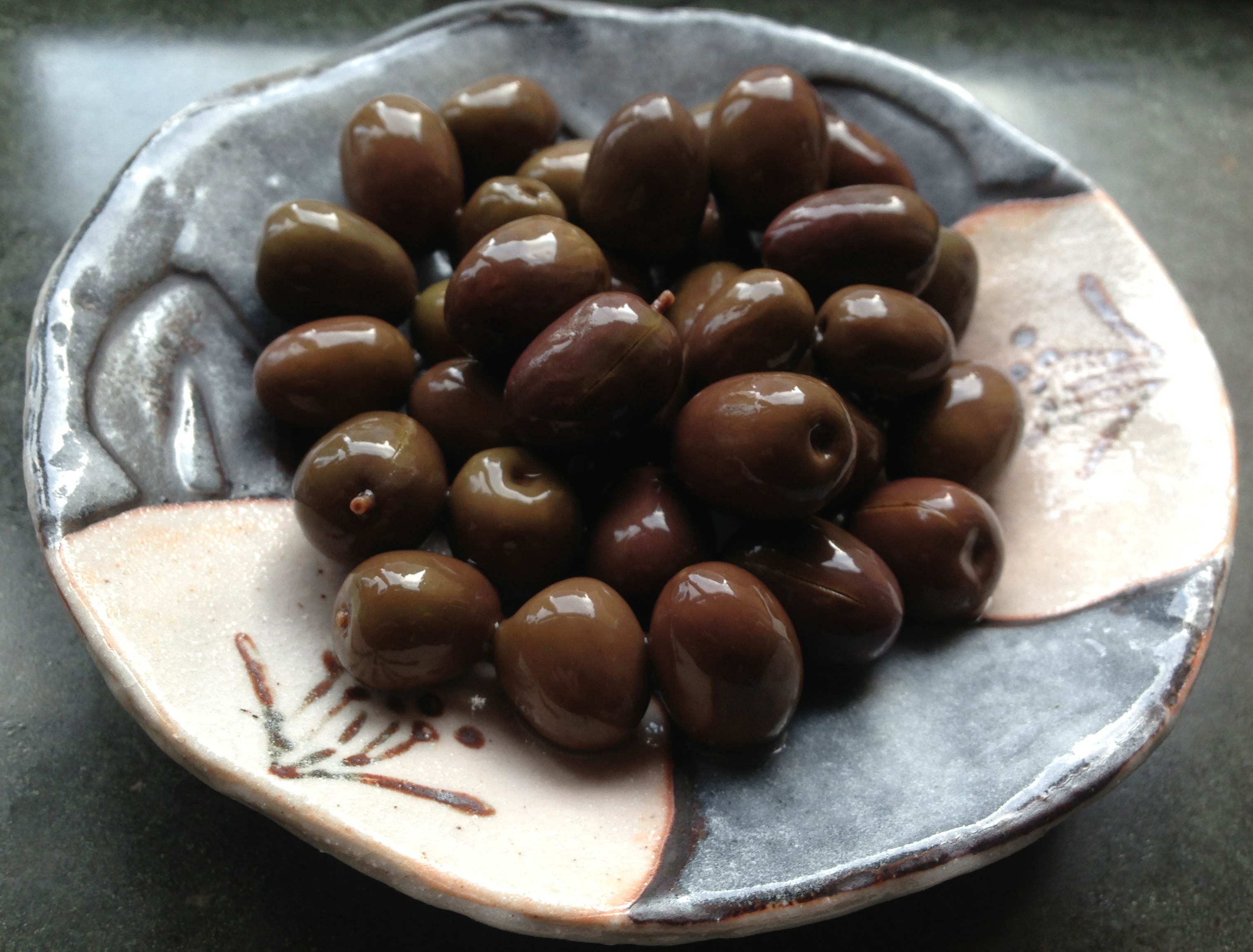 I consulted the documents generously published on the web by the Department of Food Science and Technology at the University of California Davis and decided on brine-curing. Before placing them in the seasoned brine they had to be slashed and soaked in a daily change of fresh water for two weeks. They were still so bitter after two weeks I decided to extend the fresh water treatment for another week. Then, with some fennel seed, chilli and vinegar added to enliven the salty brine, they went into a medium-temperature, dark cupboard for a month or two of maturation. The colour changes dramatically from the bright green on the left to the deep olive green on the right.