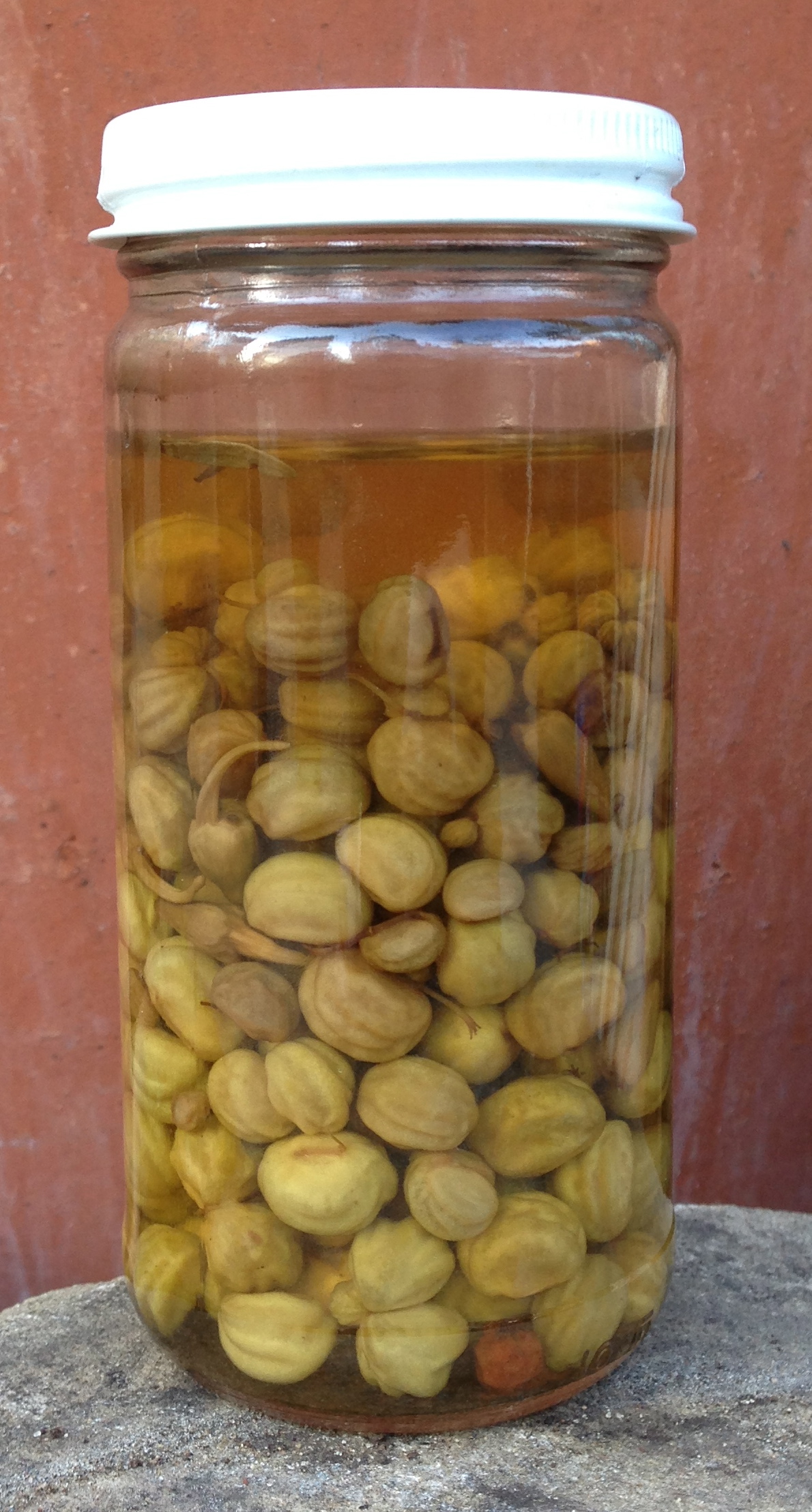I checked out a few versions of this process before I decided how to do it. Quite a few recipes suggest either using a hot brine, or heating a vinegar and sugar pickle to pour over the seeds. I don’t think sugar and capers should have anything to do with one another, and I prefer to keep everything as crisp as possible. So, I went for a cold process, very much like the one recommended for ‘nasturtium capers’ in Pat Corbin’s River Cottage Preserve Handbook.