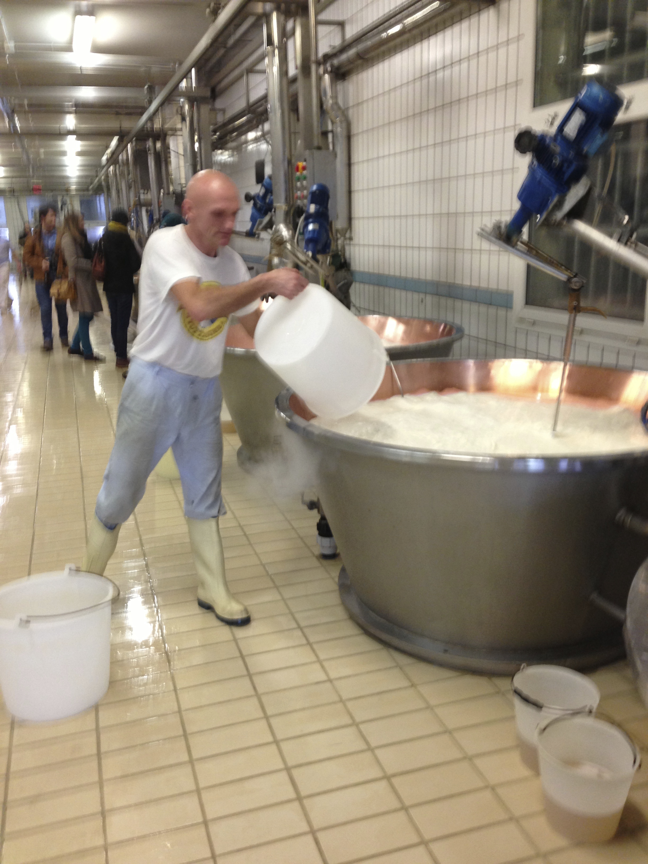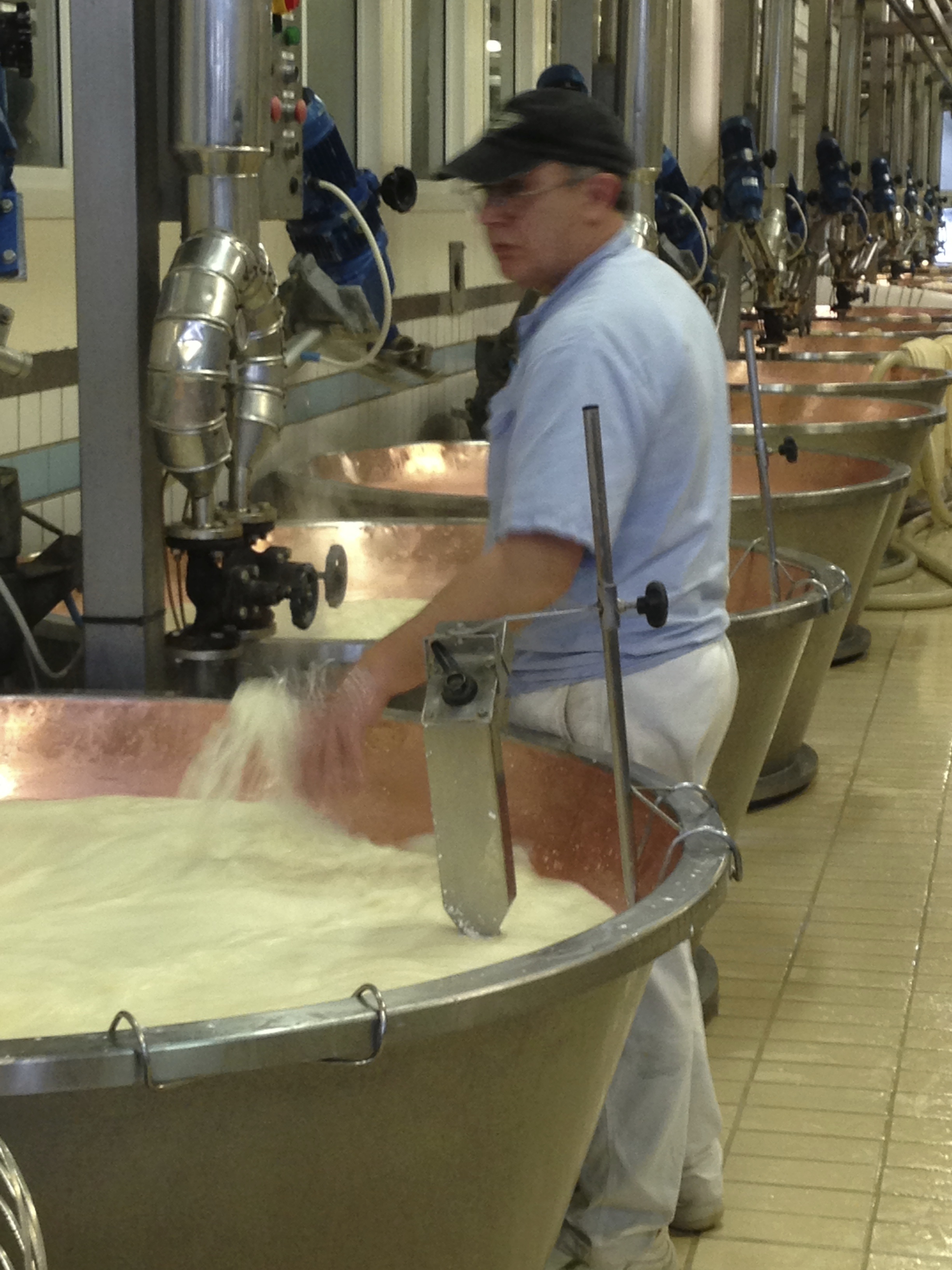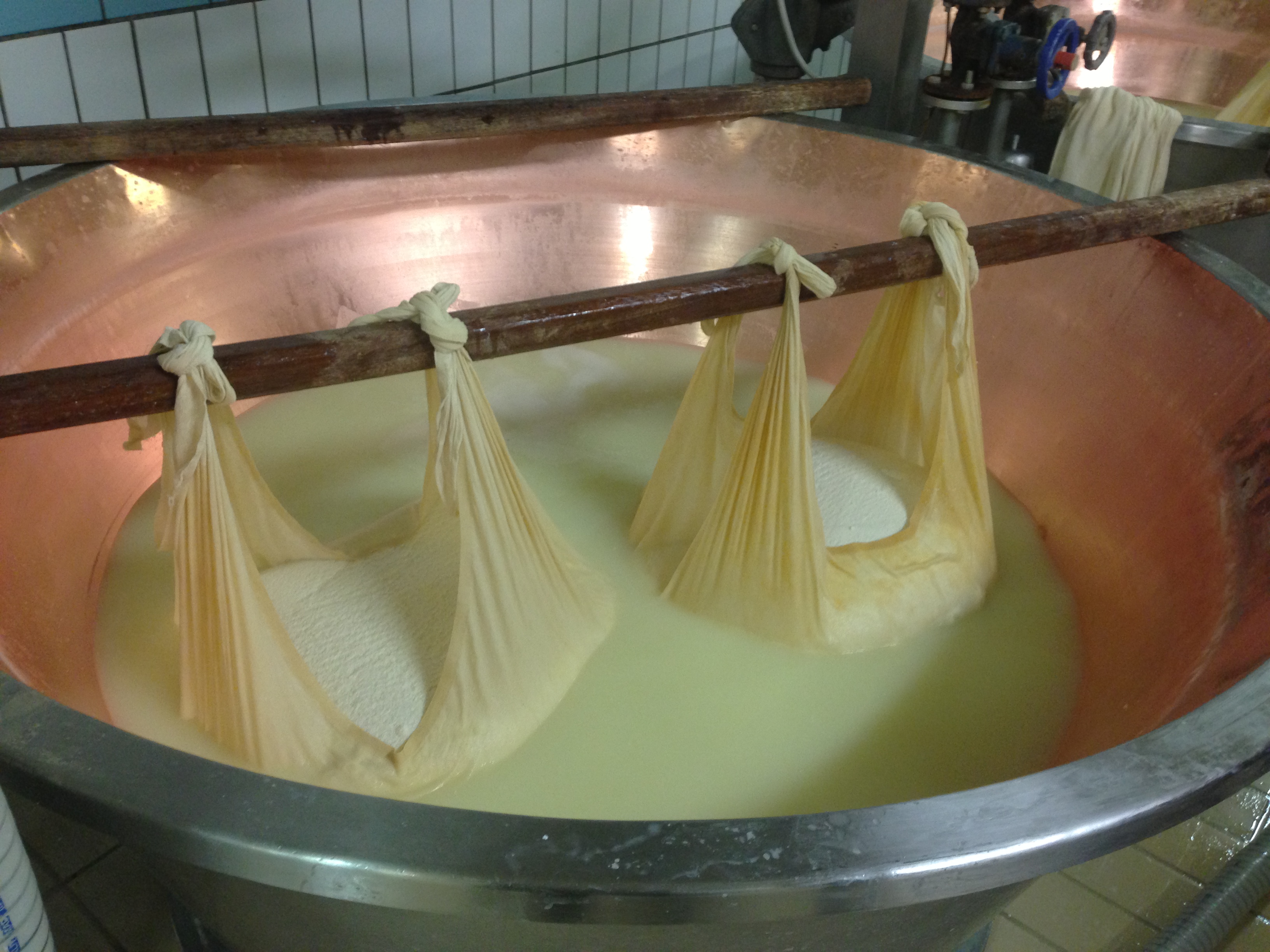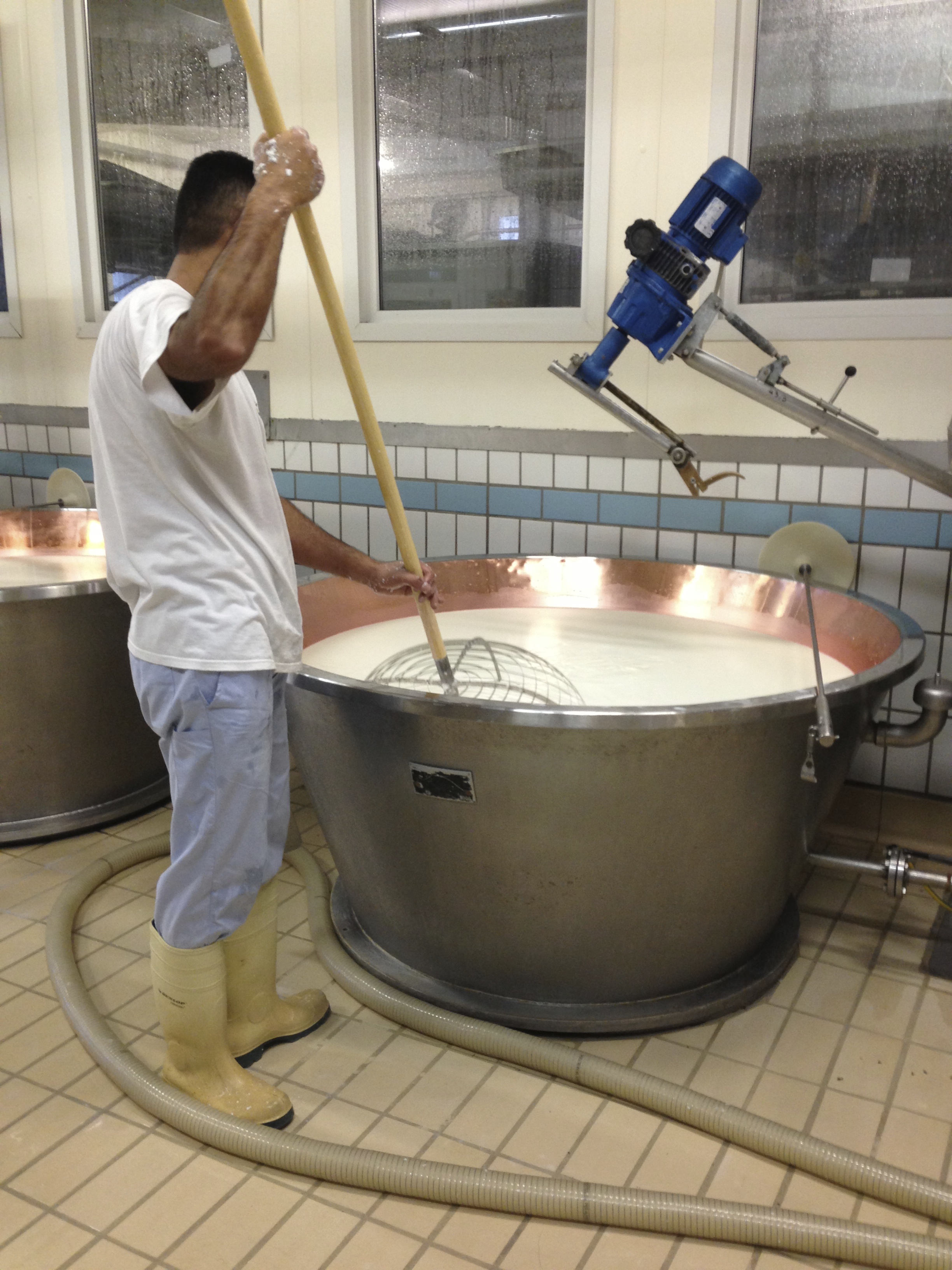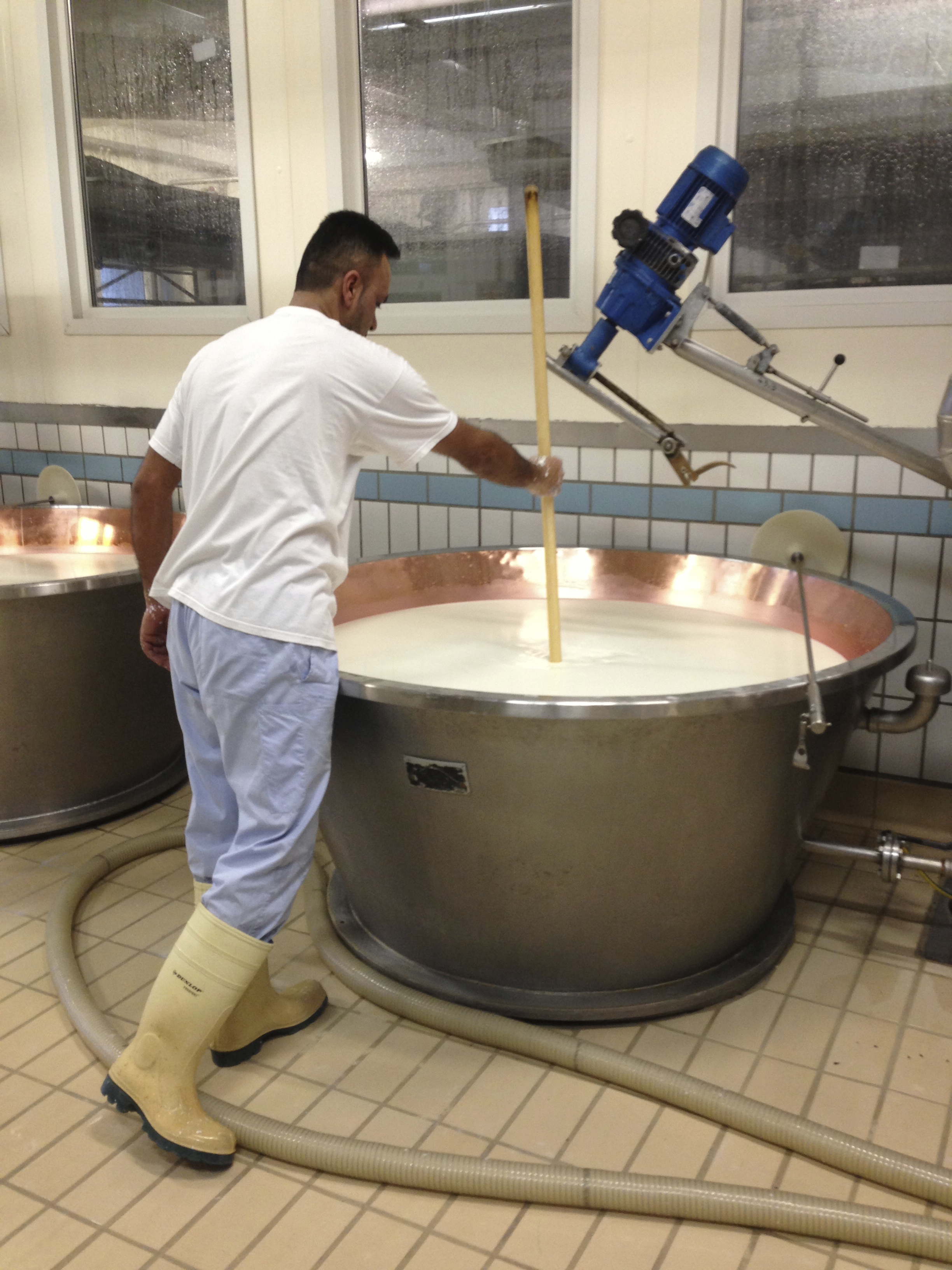 The two batches of milk are mixed together and transferred into huge copper-lined vats. Some whey kept from the day before is added and the milk is stirred whilst being warmed by steam heat to around 32ºC (90ºF). Rennet is poured in.