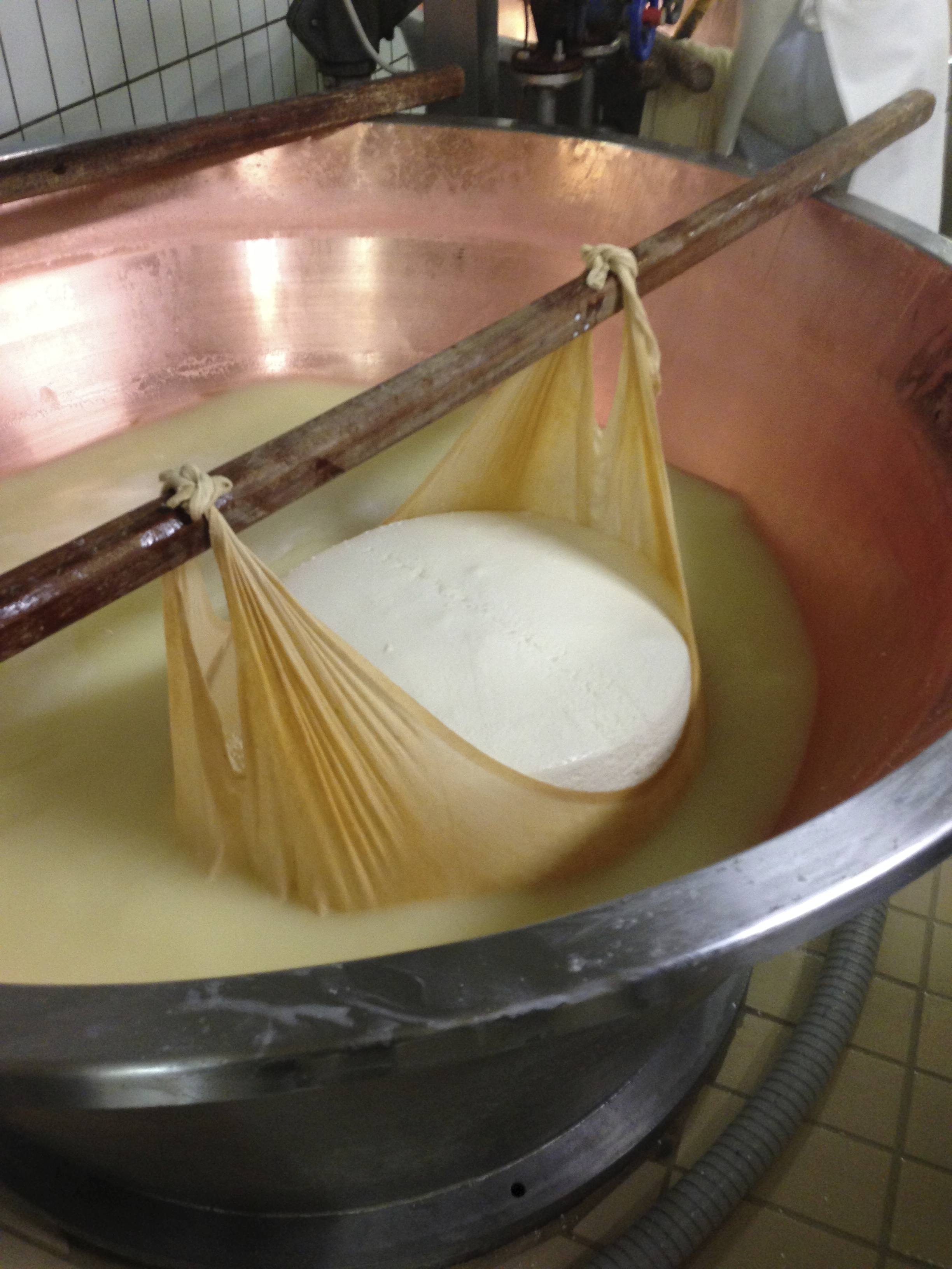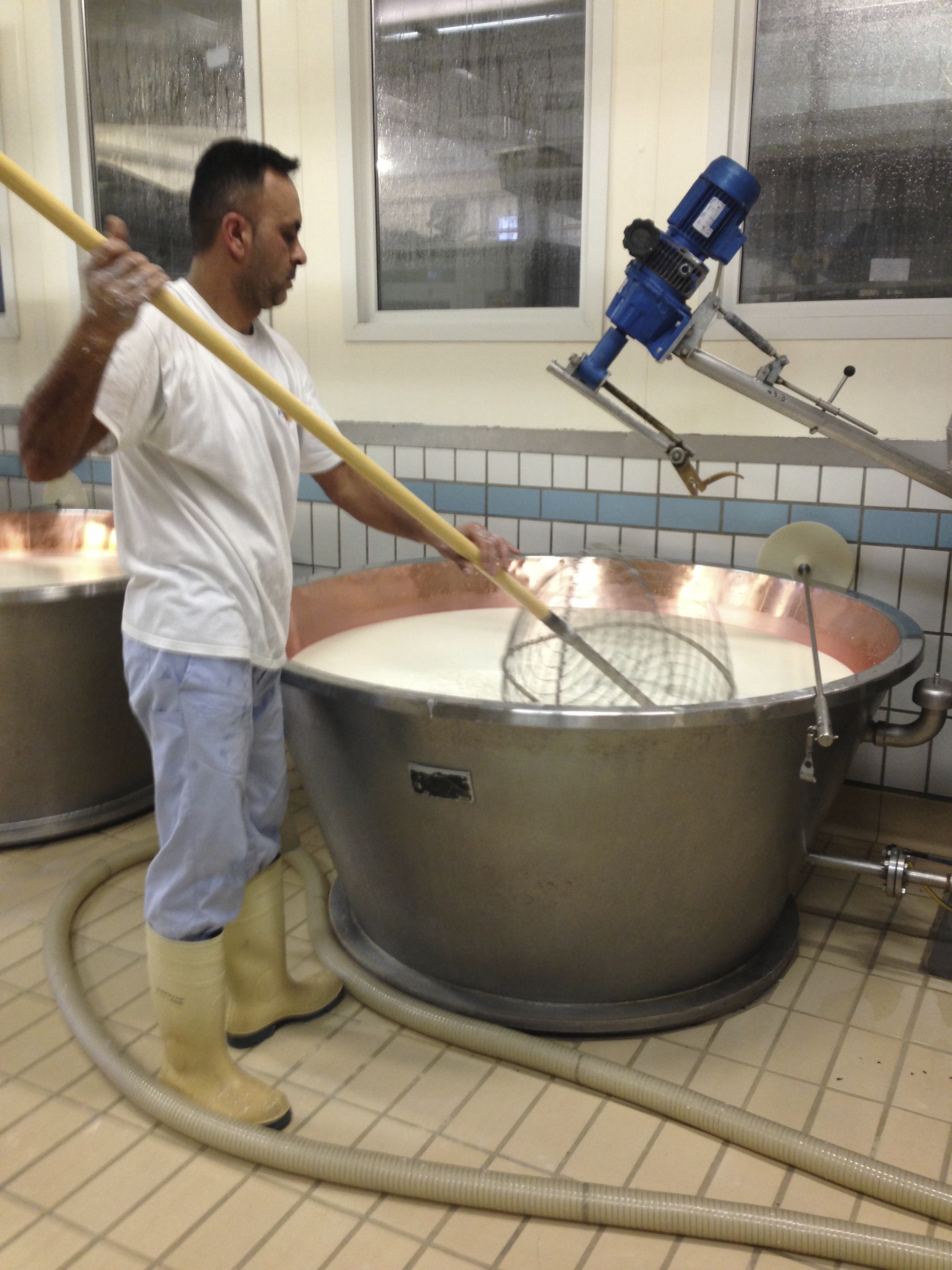 Once it has started to coagulate, the curds are broken up by hand using huge long-handled wire cages, a bit like giant balloon whisks.