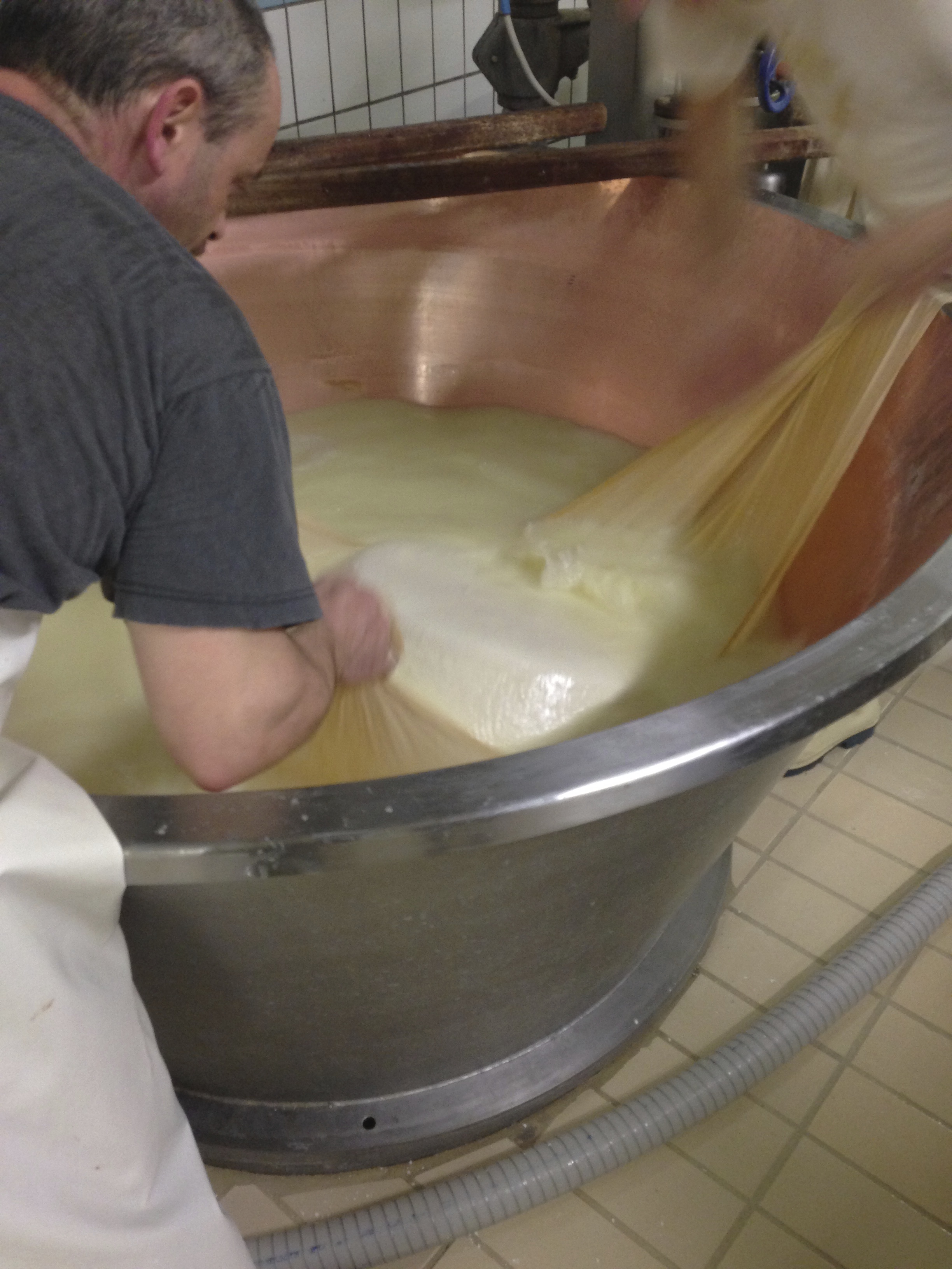 Cheesecloths are draped over the sides of the vats in readiness for forming the cheese, and some of the whey is drained out of the vat to make the next stage a little easier. A large metal hoop is dragged through the curds to ensure they are not stuck to the bottom of the vat.