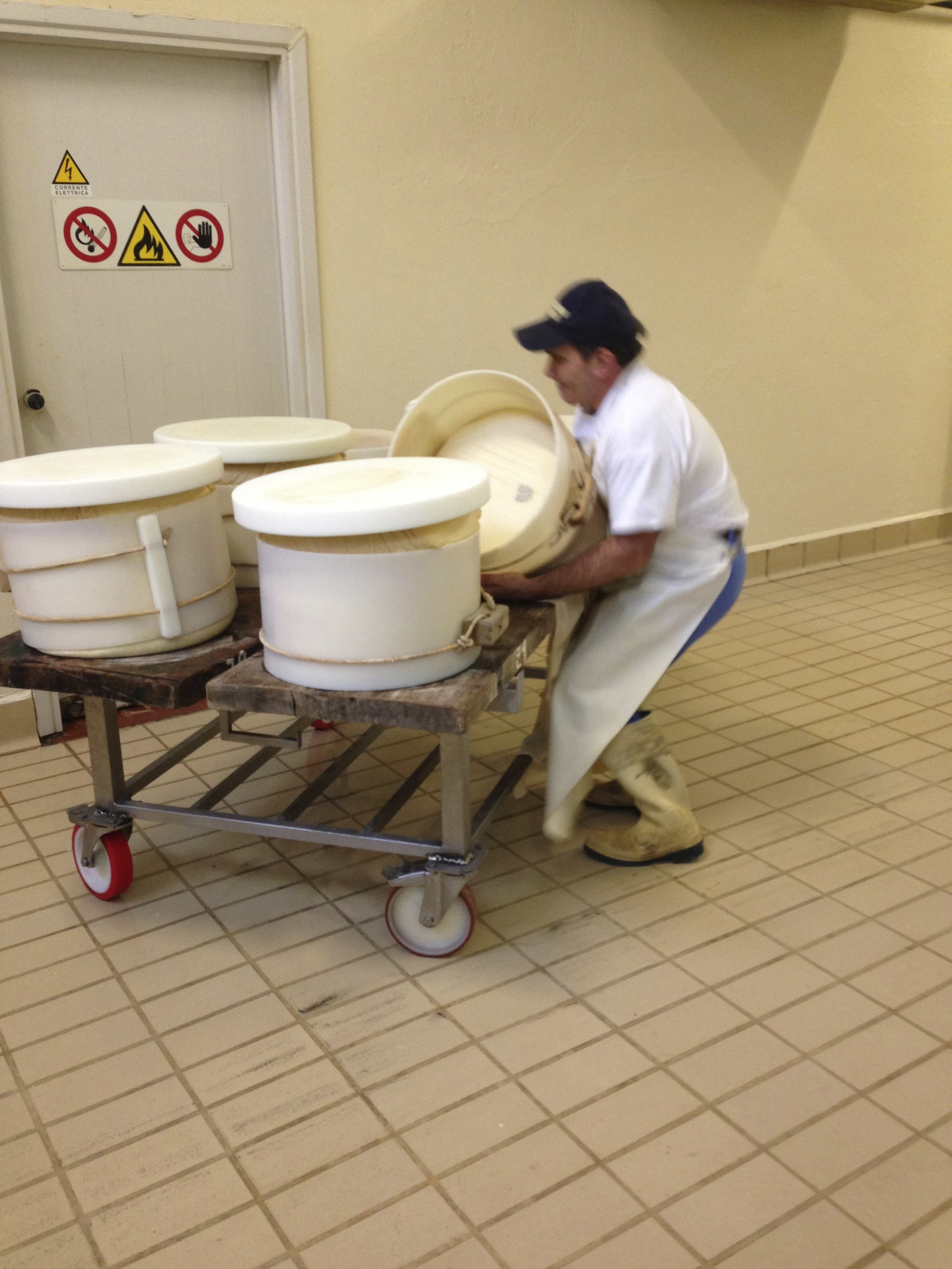 The day’s cheese is made from last night’s milk, which has been left to stand in huge steel trays and had the cream skimmed off, mixed with this morning’s milk, which is left whole. At the Latteria Tullia, the milk comes in from a number of local farmers within the Emilia Romagna region, where the cows are grass-fed.*