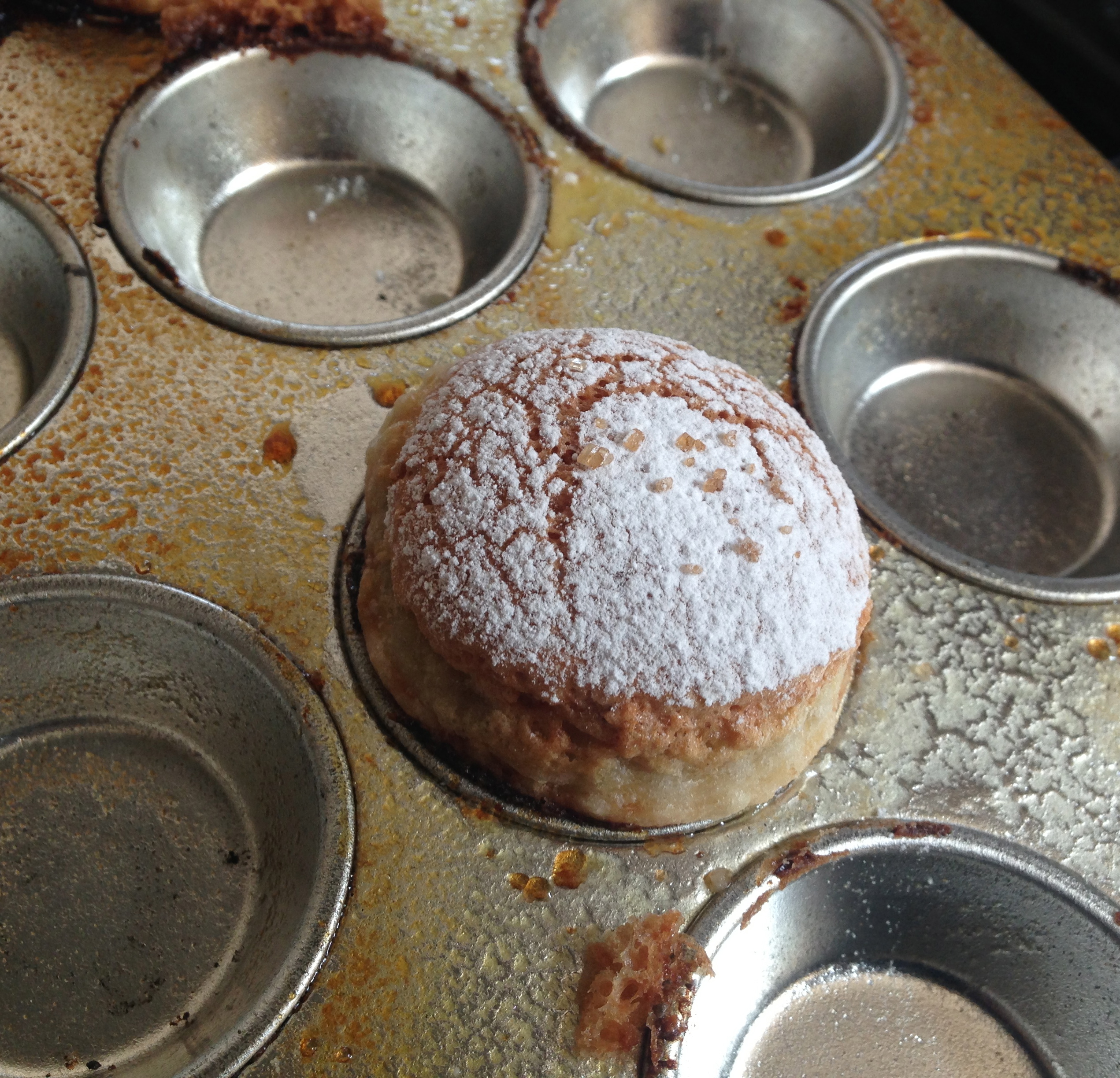 IMG_2377Sift icing sugar over them to give a light dusting over the whole surface, and sprinkle a few grains of Demerara sugar on each one.