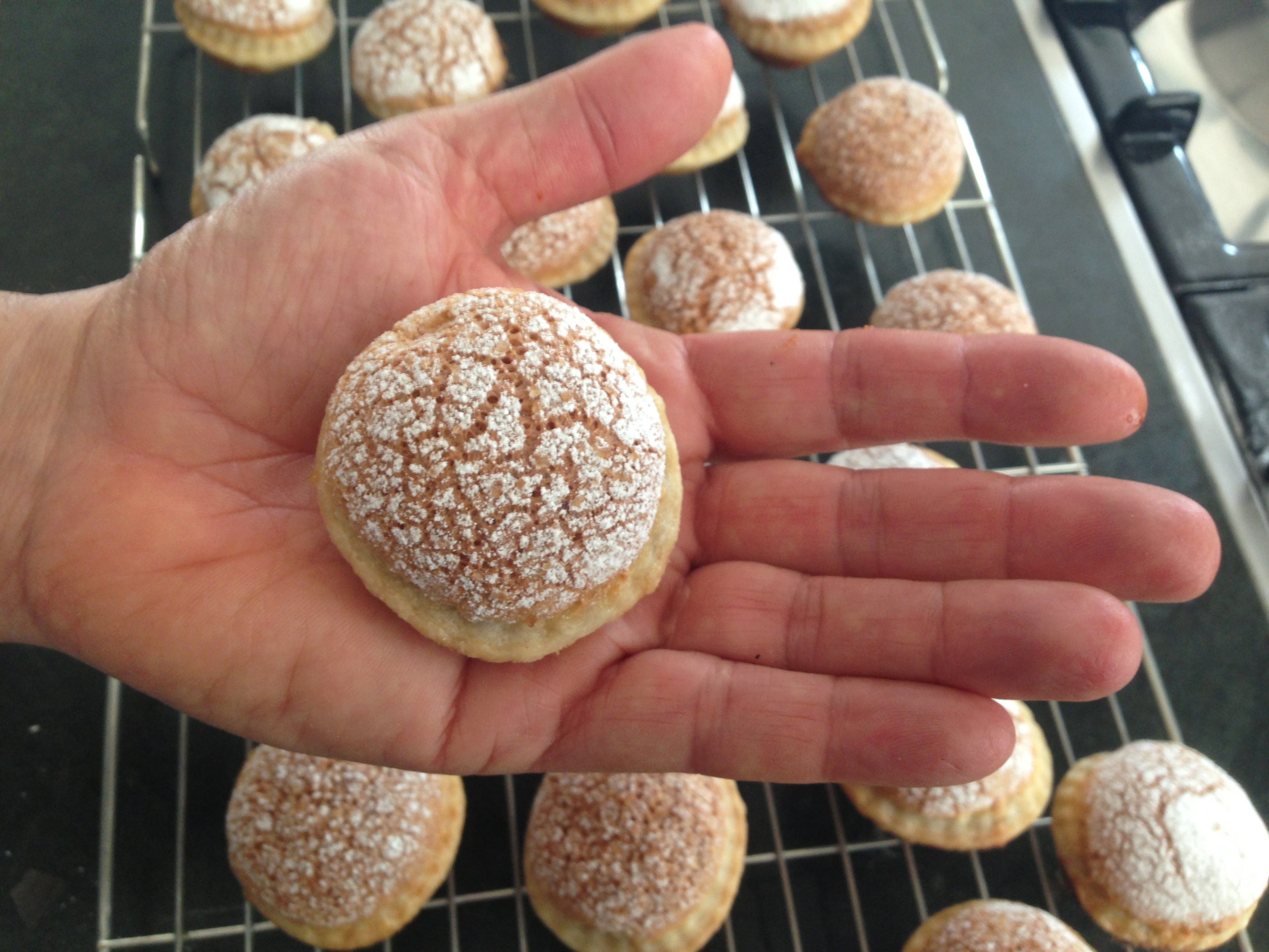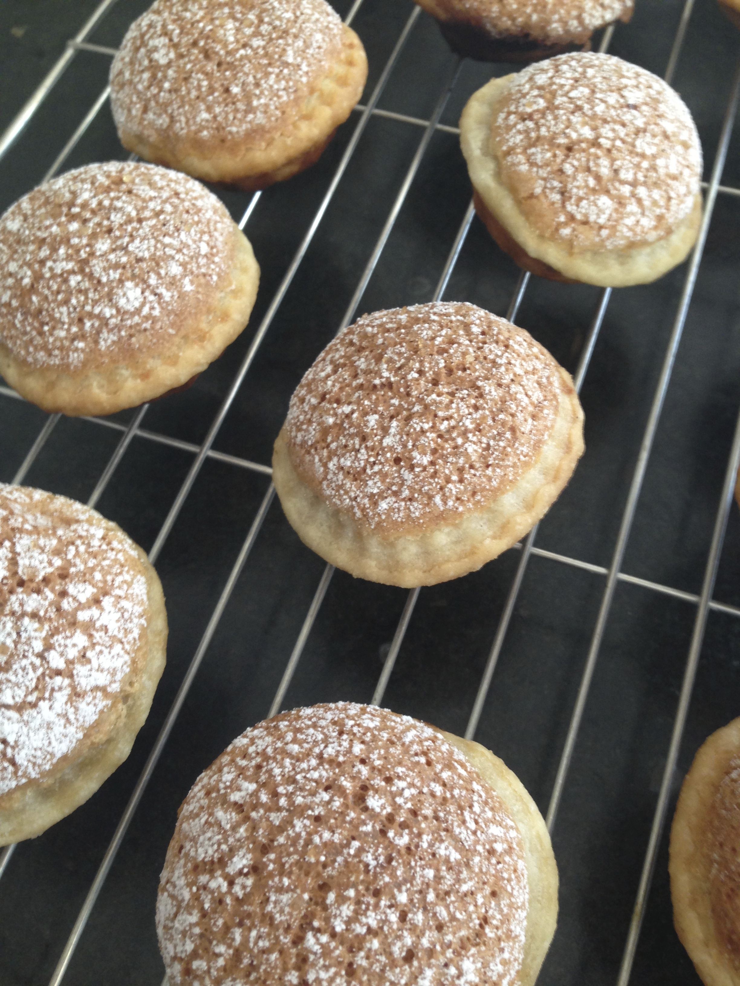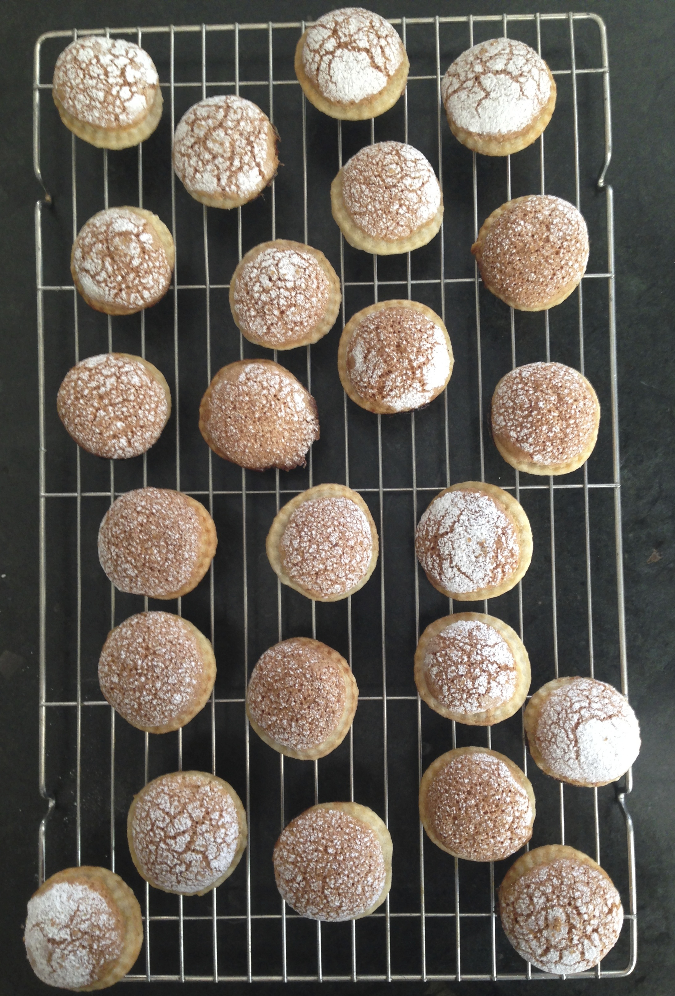 IMG_2379Bake in a medium to hot oven, with even bottom heat, for about 10-15 minutes. The pastry and the filling will puff up to an unlikely-seeming height – if they don’t, adjust the oven temperature and stand your filled trays on a hot metal tray or baking stone.