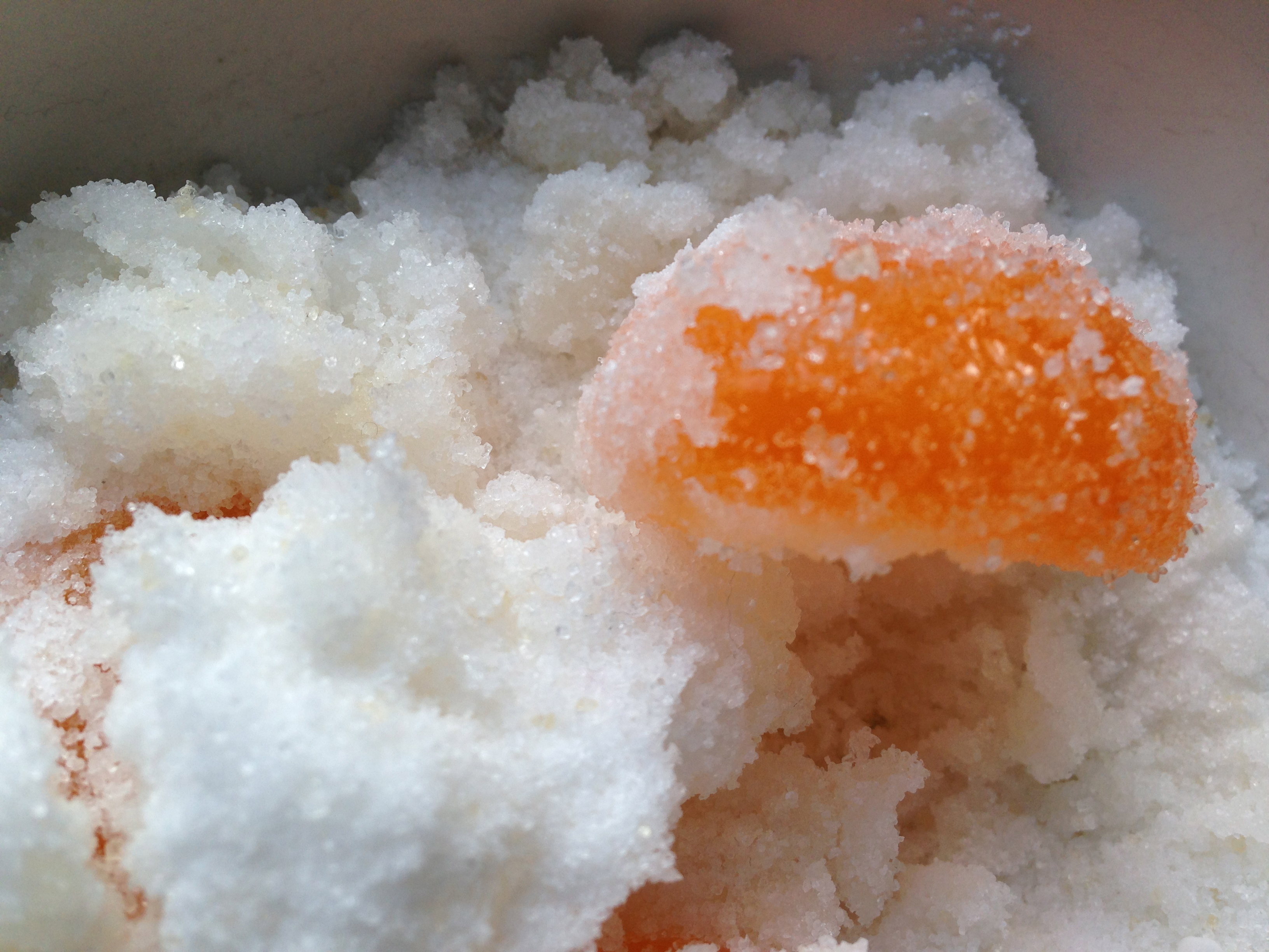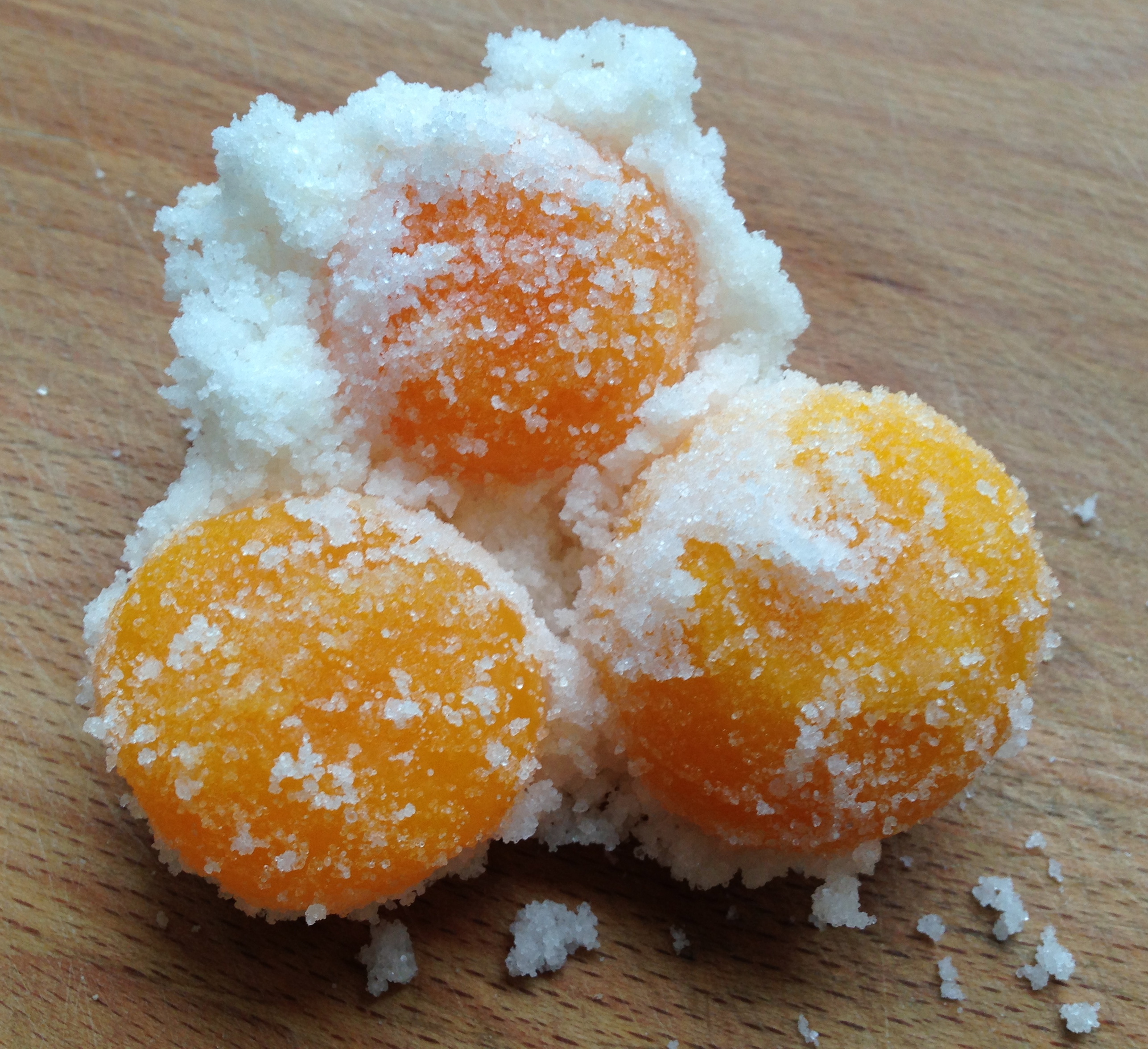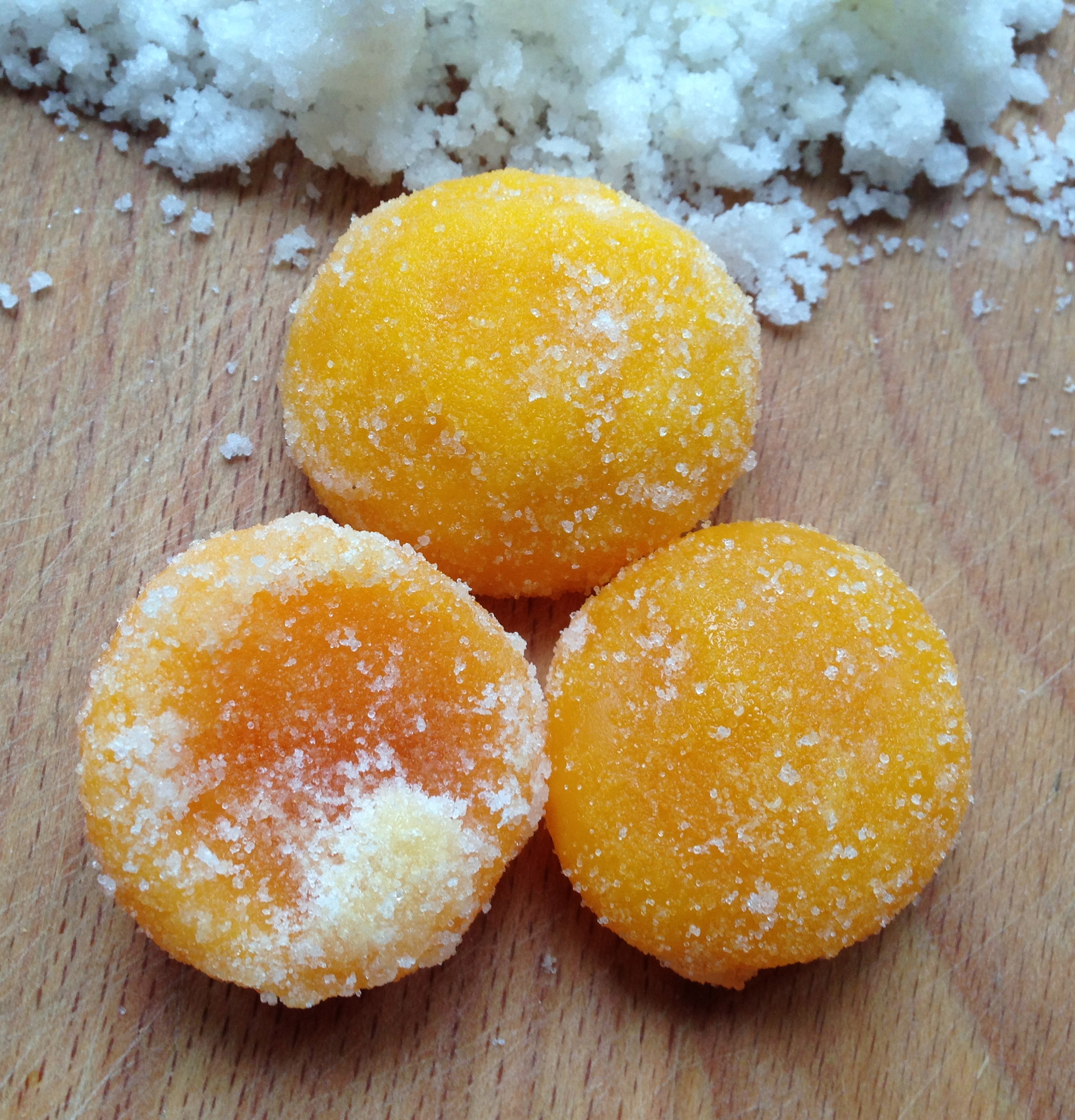 yolks have already started to firm up! They look a richer orange, and are holding a definite shape. It is easy to touch them without fear of breaking them, so I can gently ruffle up the now damp -even wet – salt/sugar and turn them over. I decide to add some more salt/sugar to give the yolks a more complete covering. Then back into the fridge they go.