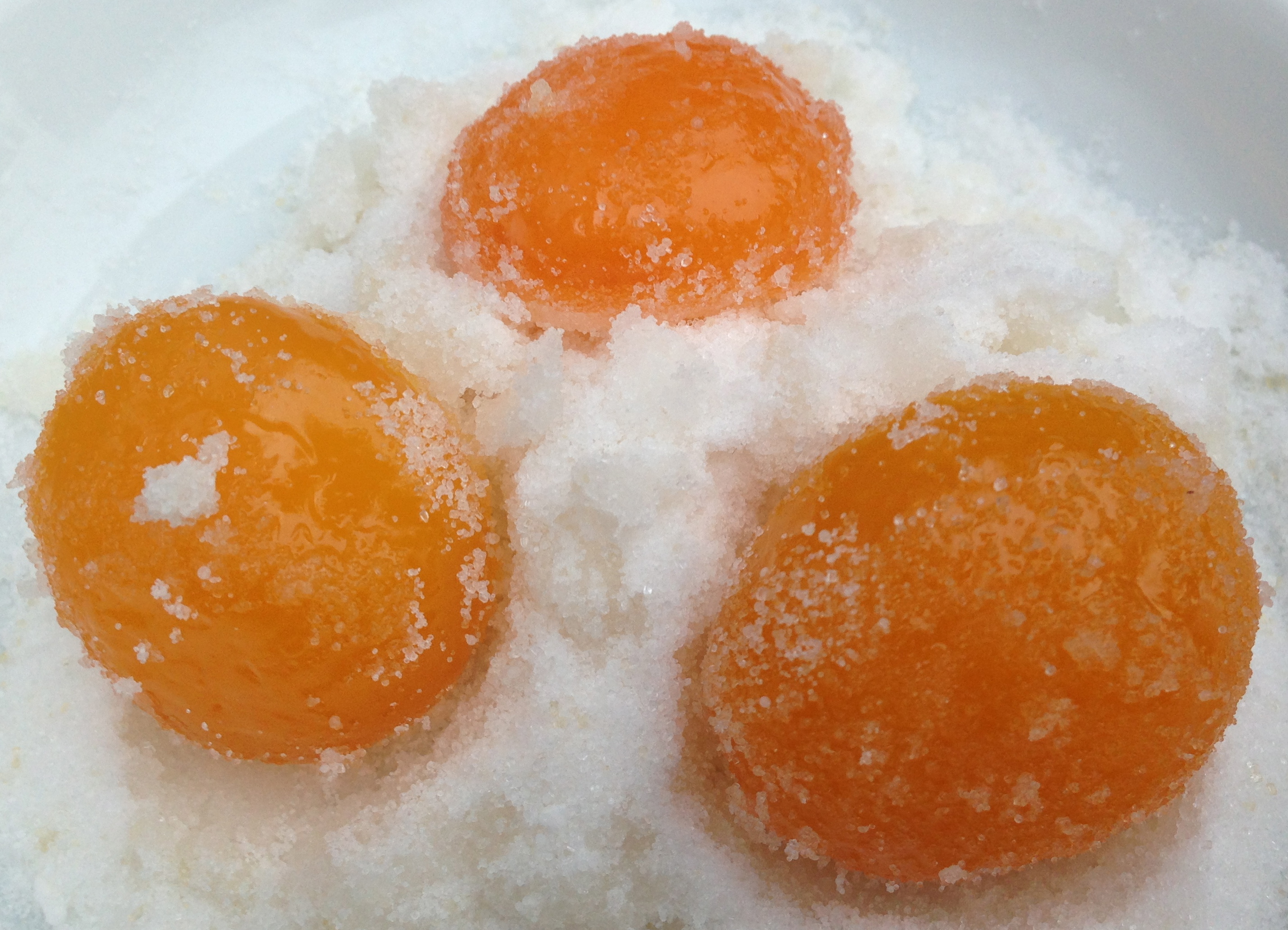 Decide how many egg yolks you want to cure. Make a 50/50 mix of fine salt and sugar, enough to surround the egg yolks in your chosen container. Separate the yolks from the whites, making the yolks as clean as possible without breaking them. You will have to discard any that do break, so be careful. Place the yolks on a layer of salt and sugar mix, cover with some more, and put the container in the fridge. Some people advise covering, others don’t. Since a core part of the process is drying I don’t think it matters – but if you are at all worried about contamination from anything else in your fridge, cover them.