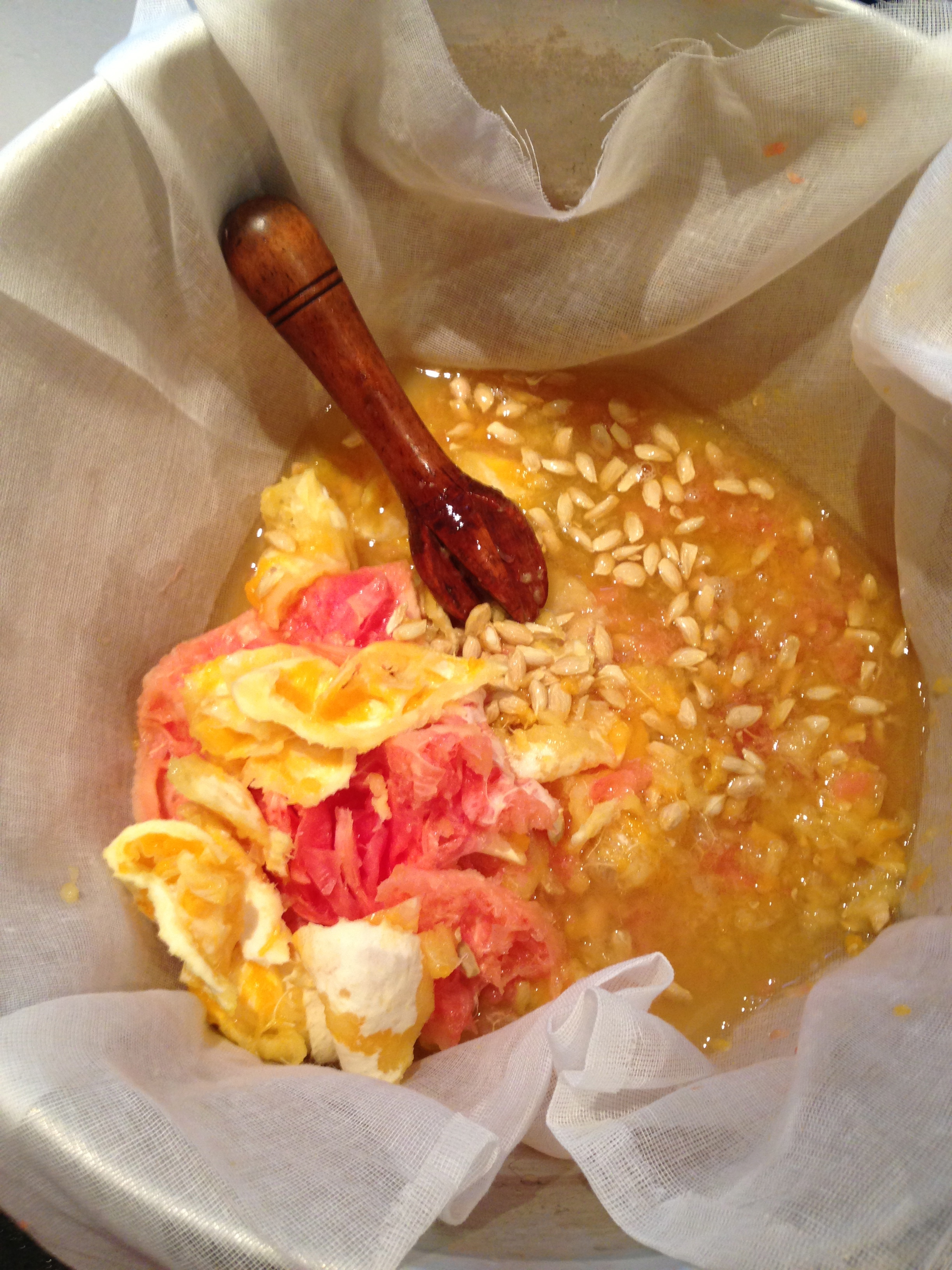 Line a basin with a piece of muslin, and squeeze the juice into it. Scrape out the flesh, pips and a layer of the pith into the muslin-lined bowl. Pull the ends of the muslin together and tie together to make a neat bag containing the pith and pips.