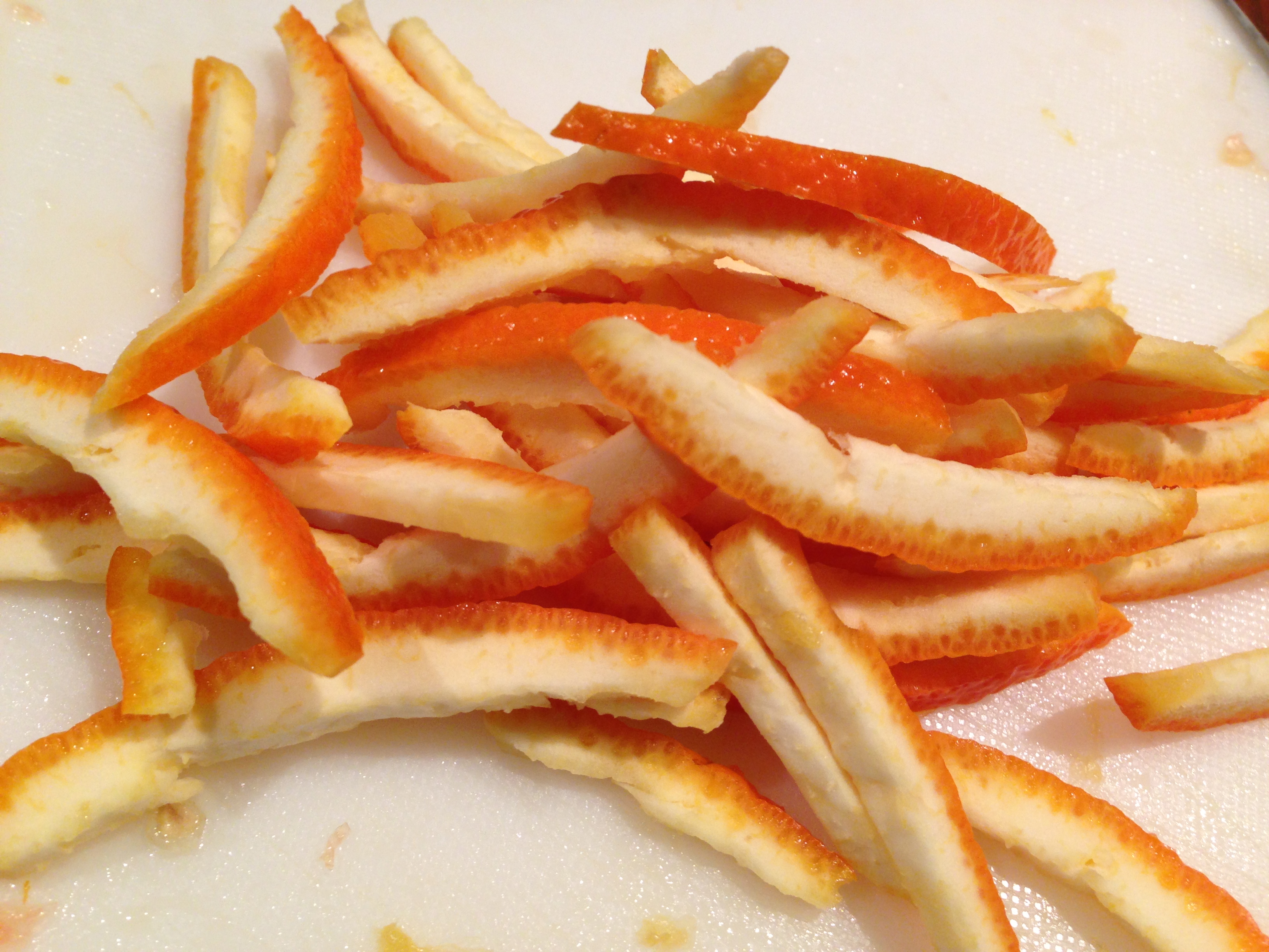 When you are ready to cook, bring the contents of the pan to a boil, reduce the heat and simmer for 1½ – 2 hours, until the peel has softened. Allow to cool slightly, and then remove the bag, squeezing out as much of its sticky, pectin-rich contents into the pan as you can.