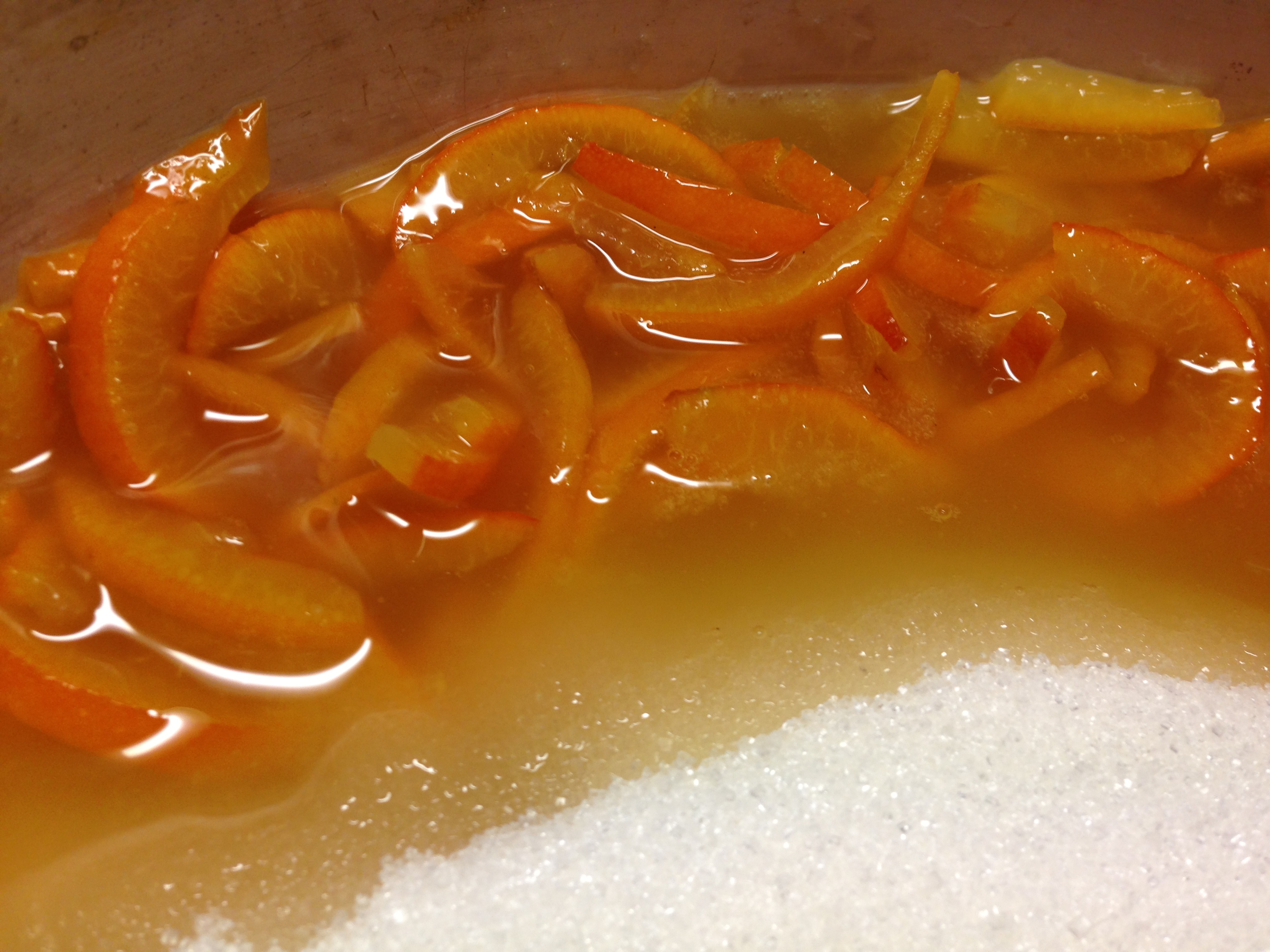 When it is done, remove from the heat and allow to cool for 15 minutes. Stir gently, and skim off any scum that remains on the surface, then pour through a wide funnel or spoon into sterilised jars, trying to make sure the peel is evenly distributed amongst them. Seal, cool, label and enjoy!