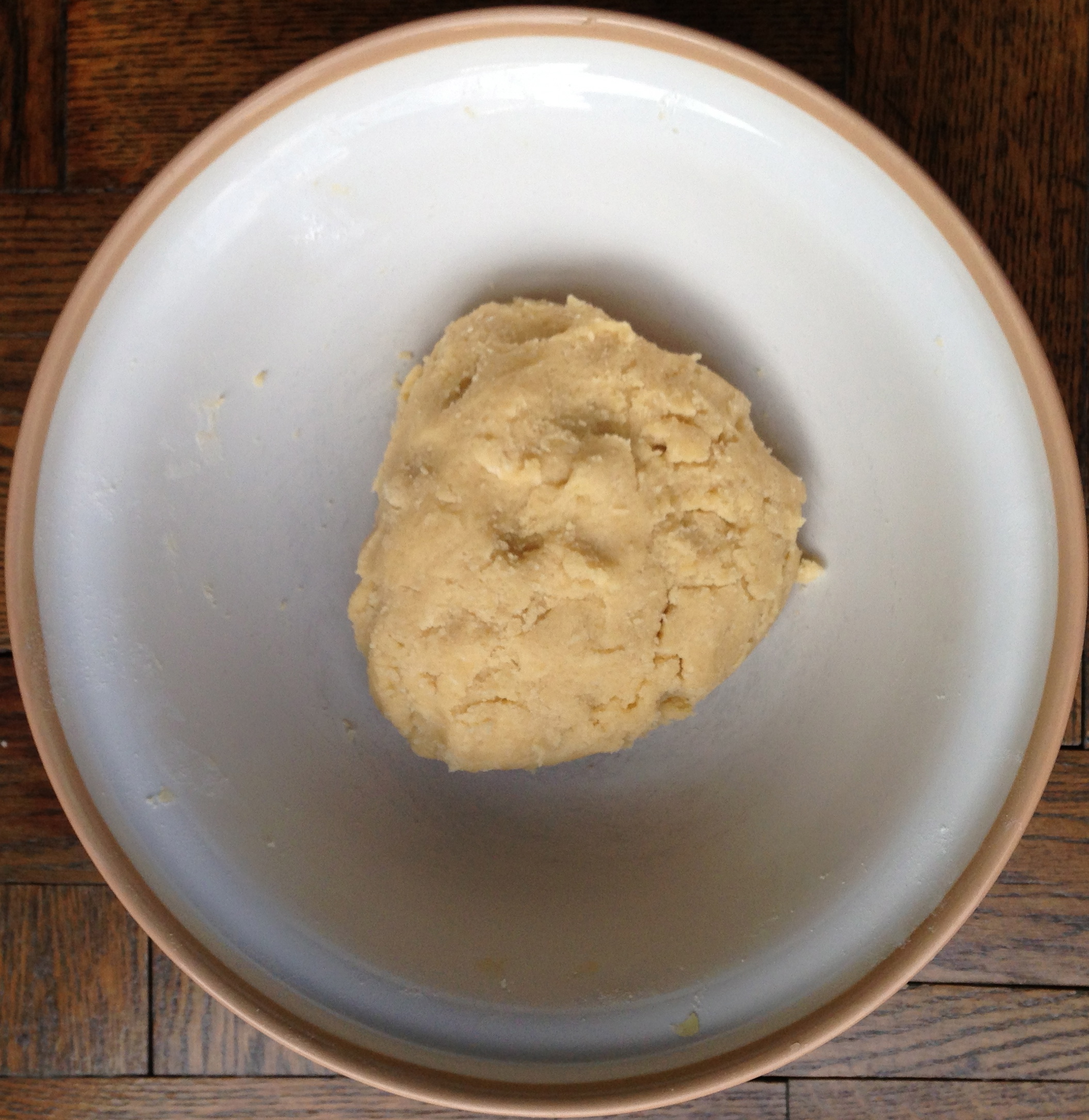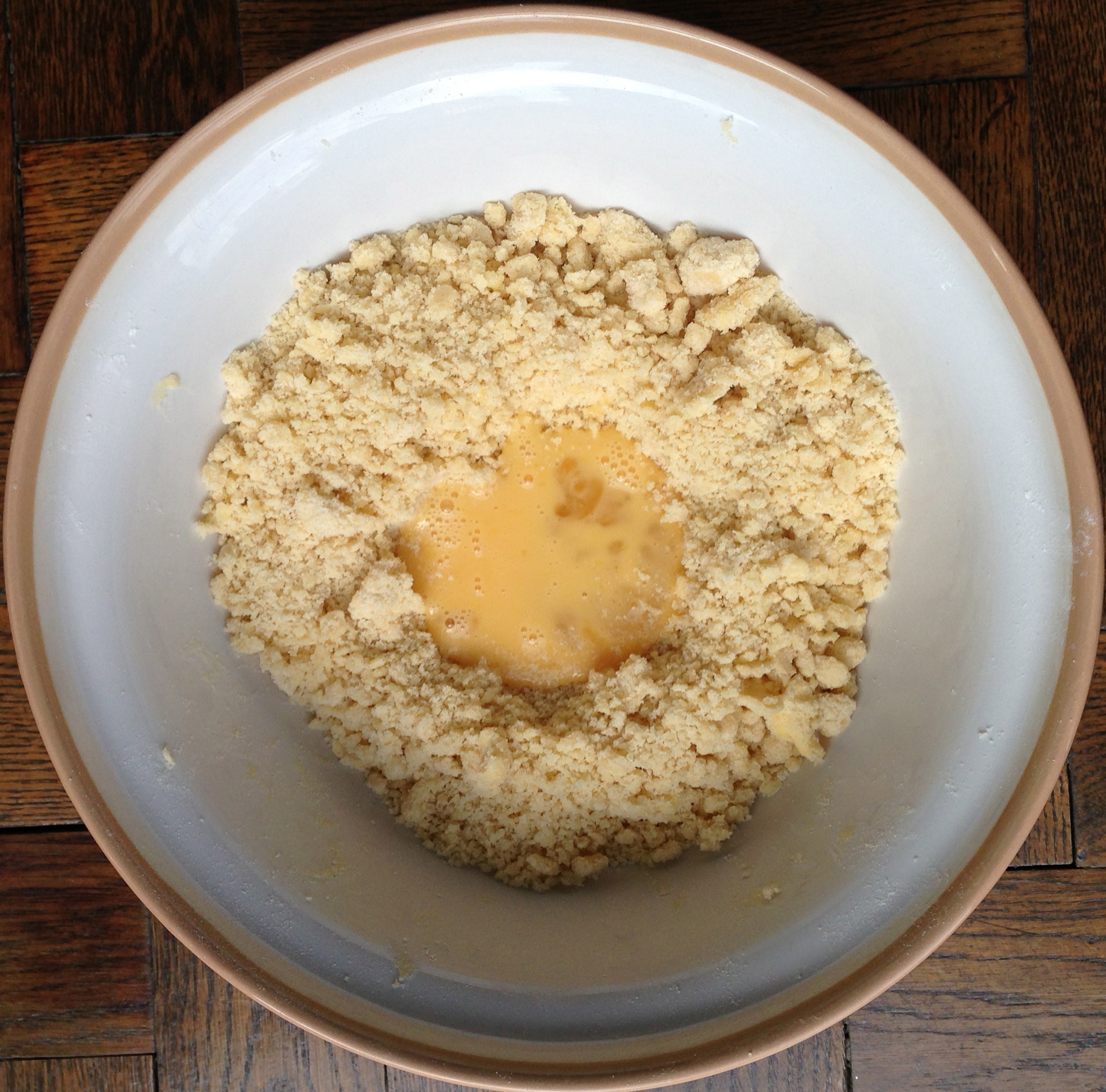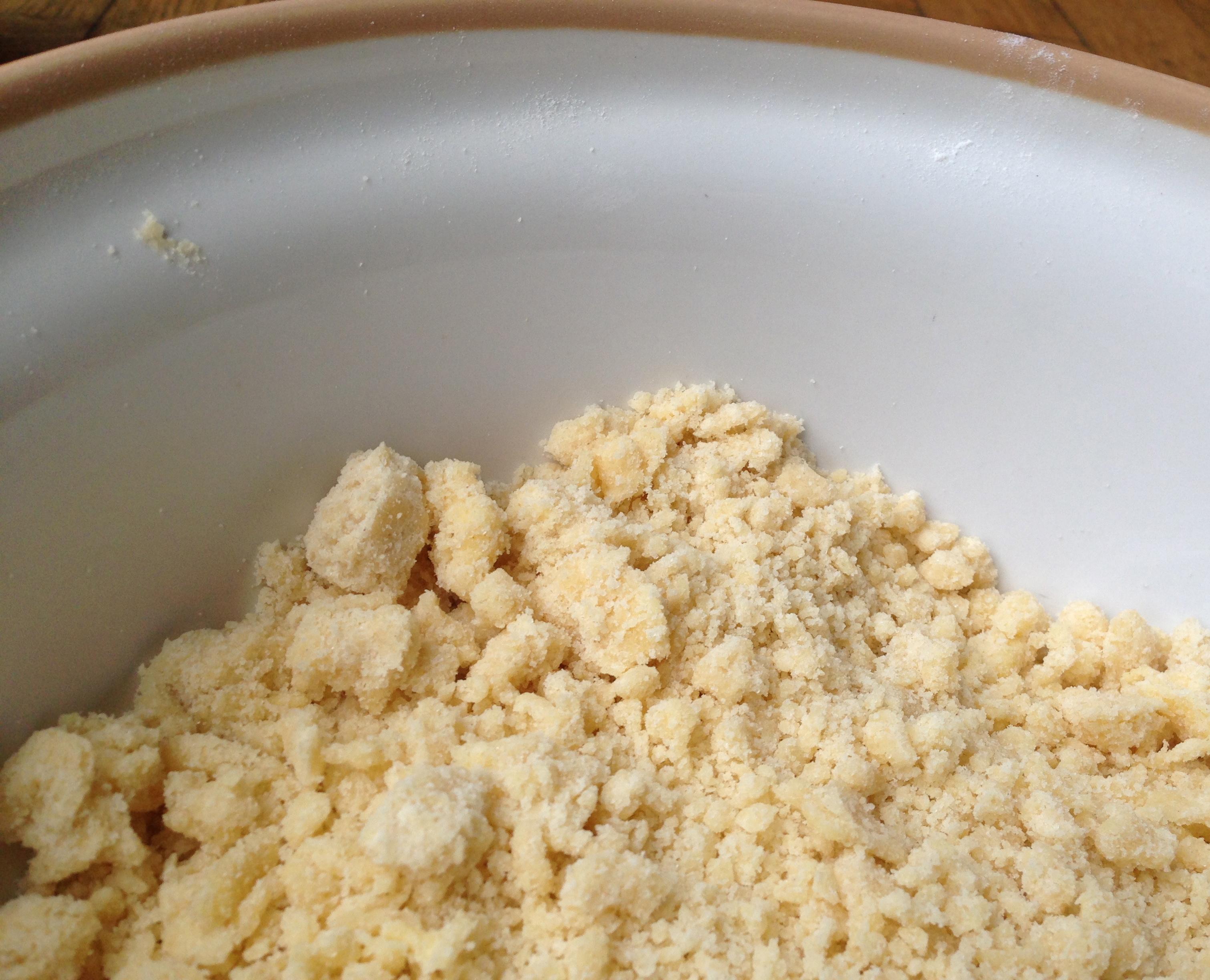 2. Knead flour, baking powder, sugar and butter together until crumbly and well mixed. Lightly beat the egg and mix quickly and gently into the mixture with your hands.
