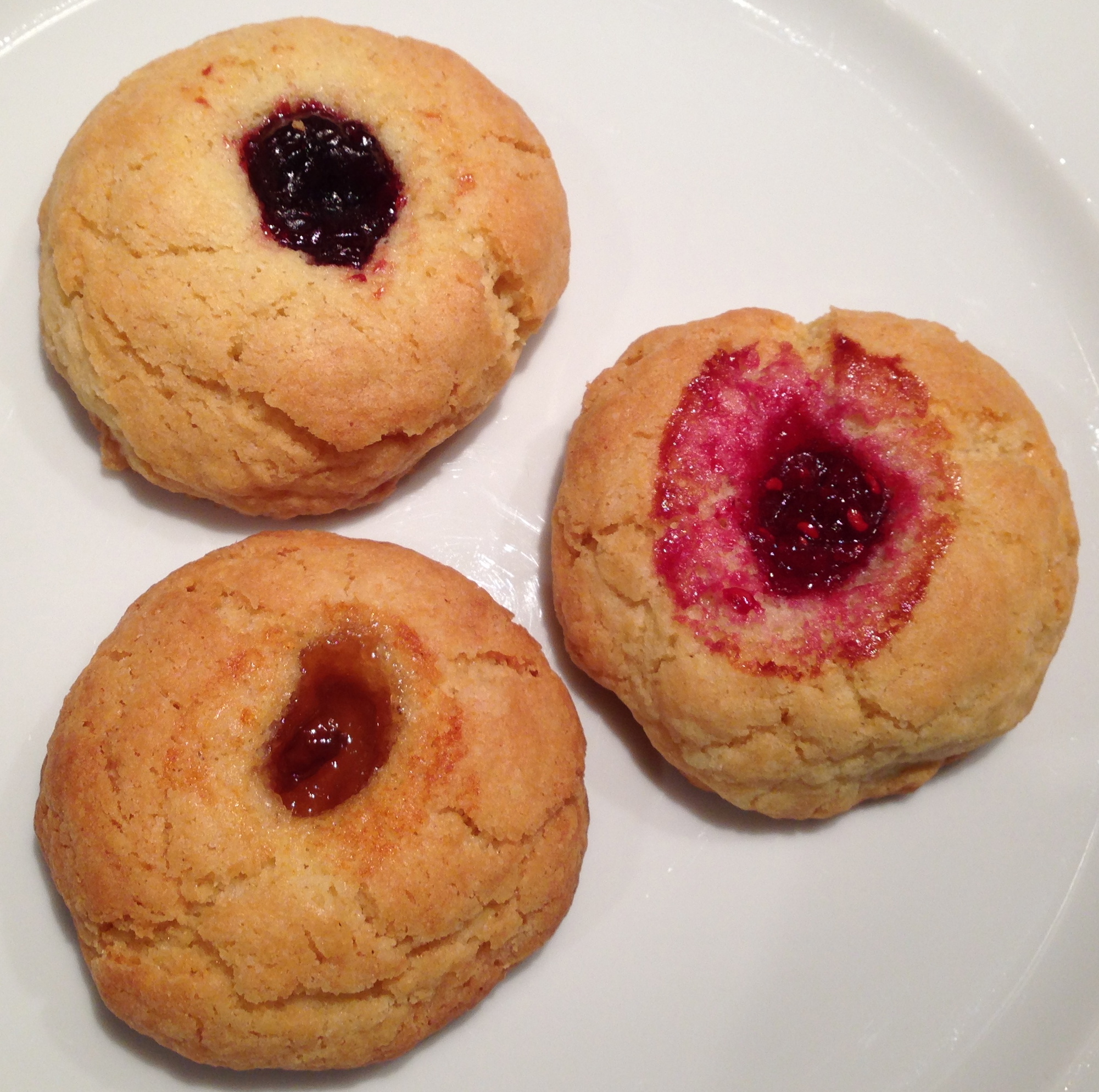 3. Shape the dough into about 20 little walnut-sized balls in the palm of your hands and place on a baking tray, spaced out. Poke your finger into the middle of each one, flattening the biscuit slightly and leaving a deep dimple in the middle. Fill the dimple with jam of your choice, and bake in the pre-heated oven for about 10 minutes or until golden. Cool on a rack and eat immediately.